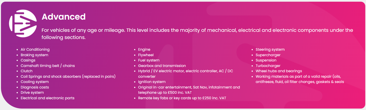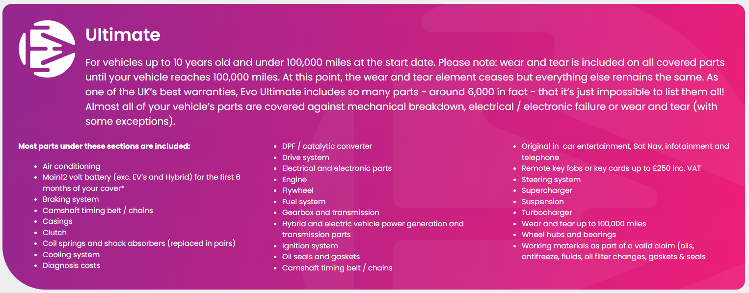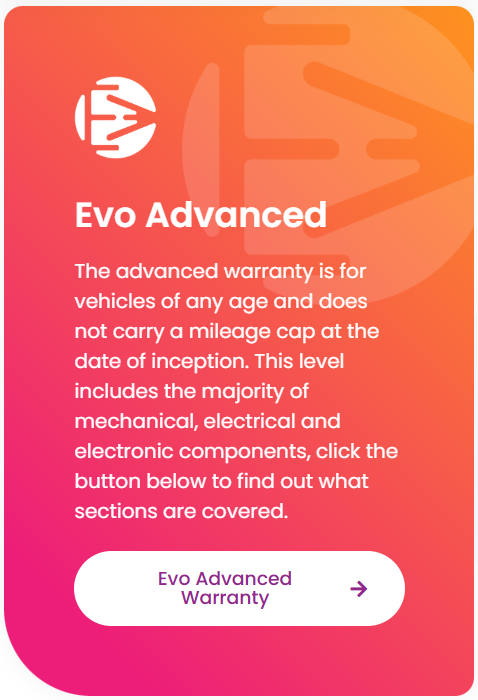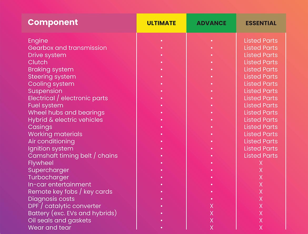 Evolution Warranties will pay towards the cost of repairs including parts, labour and VAT up to your individual claim limit. Below is a short comparison of the different plan types – please see the full list before purchasing your warranty.